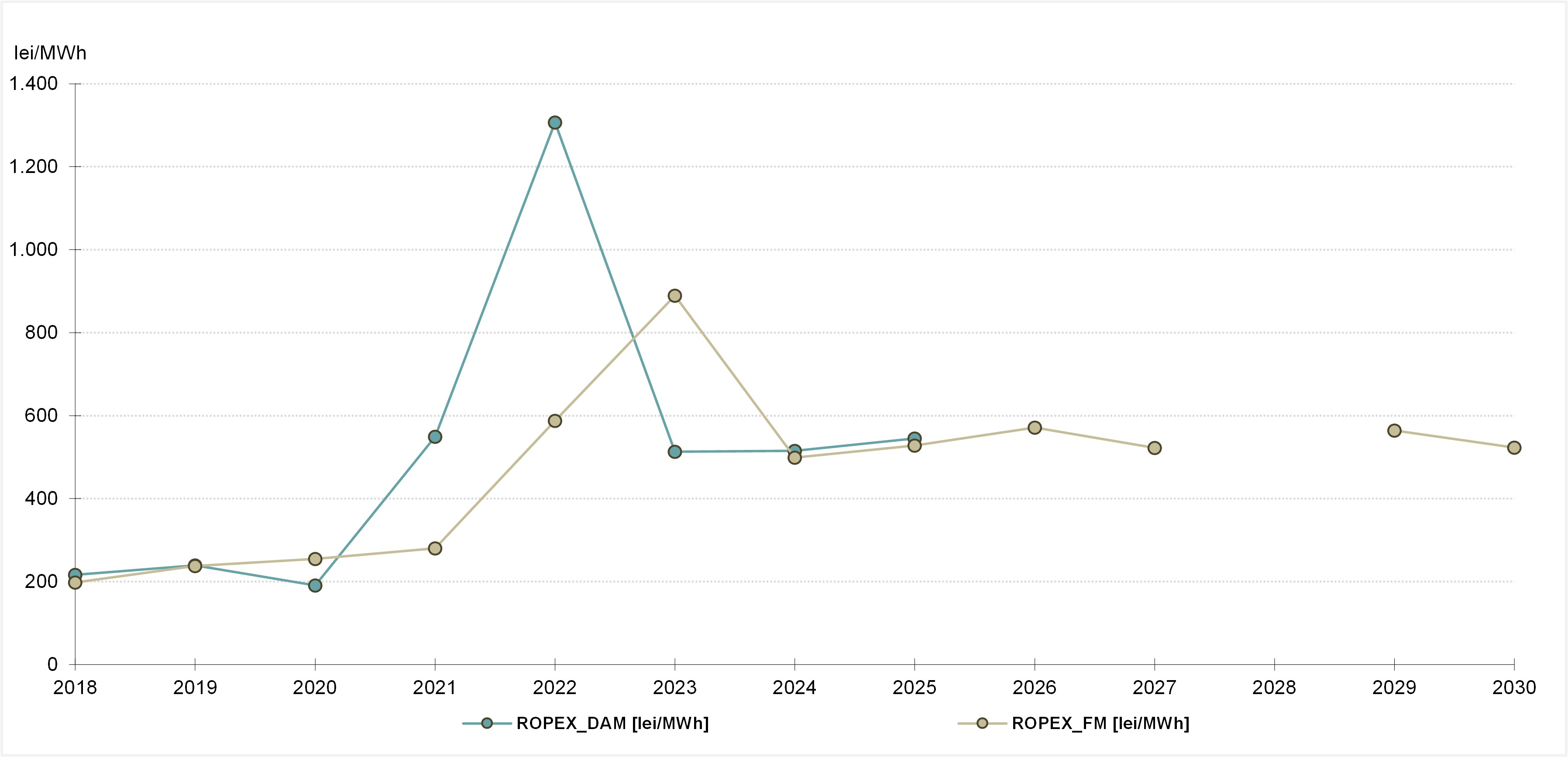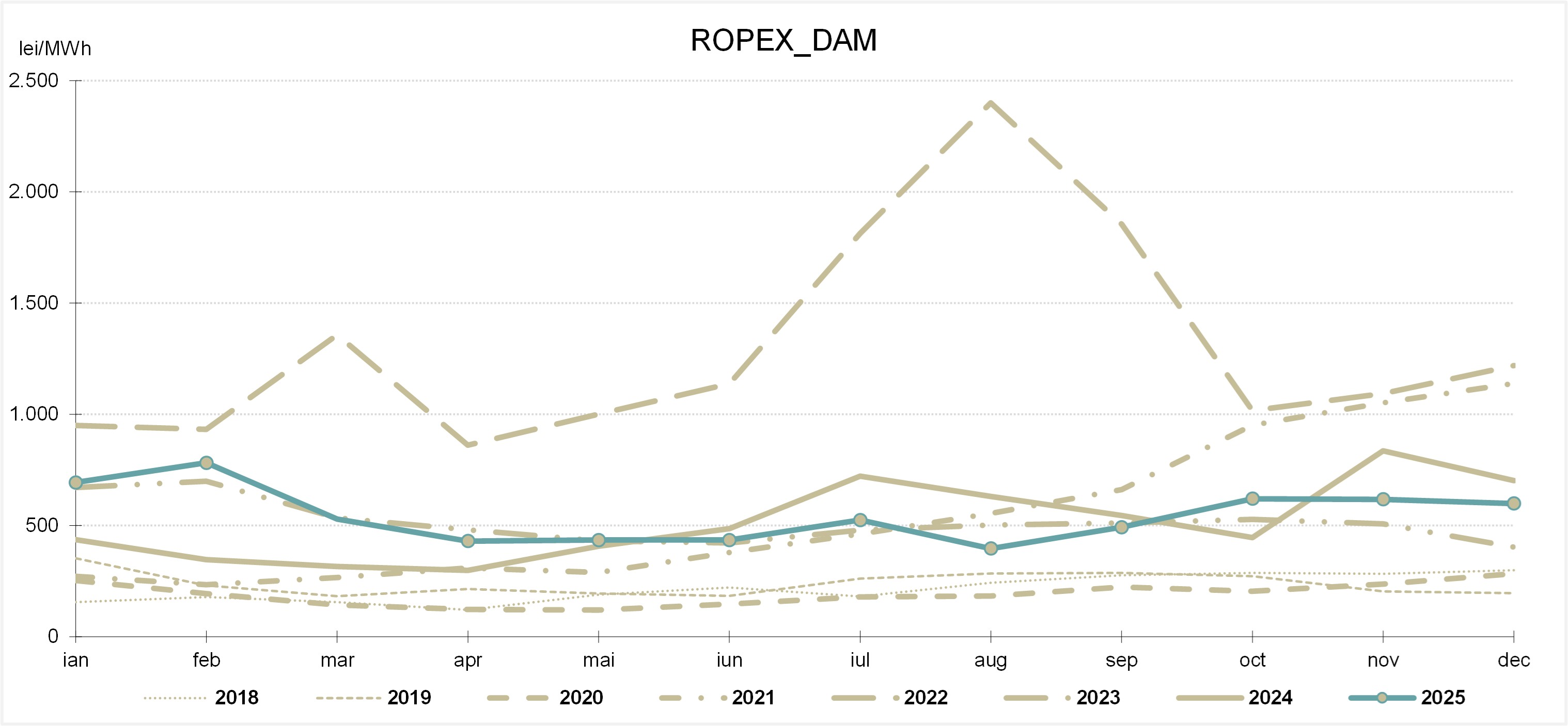 Prețul anual mediu ponderat stabilit pe PZU a fost de 575,22 lei/MWh (114,21 EUR/MWh), în timp ce prețul anual mediu aritmetic de tranzacționare a fost în 2025 de 544,98 lei/MWh (108,16 EUR/MWh), în creștere față de valoarea corespunzătoare anului 2024, de 514,96 lei/MWh (103,51 EUR/MWh). Natura variabilă a datelor fundamentale cu privire la energia electrică (producția, consumul, transportul de energie electrică, inclusiv indisponibilitatea planificată/neplanificată a unor unități de producție și instalații de distribuție și/sau transport), precum și prezenta unor fenomene meteorologice extreme cum ar fi temperaturi extreme, nivel de hidraulicitate care se abate în anumite momente de la un profil previzionat pe termen lung sau a altor factori relevanți și determinanți în diferite momente, sunt elemente care determină ca prețurile angro ale energiei electrice să fie mai volatile pe termen scurt, putând produce variații periodice (lunare, sezoniere, anuale) semnificative la nivelul indicatorilor statistici analizați. O tendință de creștere față de anul anterior se regăsește în Europa în aproape toate mediile de tranzacționare spot a energiei electrice, prin valoarea stabilită pe piața spot administrată de OPCOM, prețul PZU situându-se în anul 2025 în cadrul domeniului de variație (38 EUR/MWh; 116 EUR/MWh) al prețurilor medii stabilite în piețele spot din Europa.
